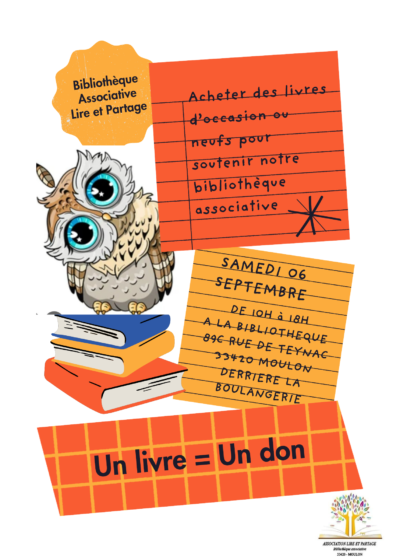 Pour toute info, nous contacter par mail: lireetpartagemoulon@gmail.com (téléphone biblio en panne mais répondeur enclenché), ou sur notre page Facebook: Pilar Rozas ou bibliothequeLireetPartage